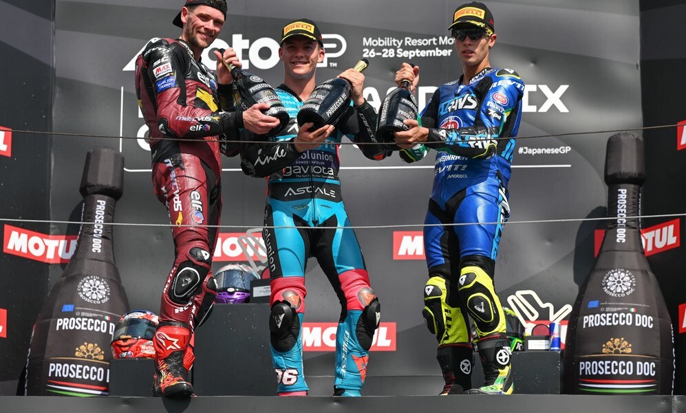 1. Bagnaia Francesco, ITA, 42:09,312, 2. Marquez Marc, ESP, 42:13,508, 3. Mir Joan, ESP, 42:16,170, 4. Bezzecchi Marco, ITA, +10,128, 5. Morbidelli Franco, ITA, +10,421, 6. Marquez Alex ESP, +14,544, 7. Fernandez Raul, ESP, +17,588, 8. Quartararo Fabio, FRA, + 21,160, 9. Zarco Johann, FRA, +21,733, 10. Aldeguer Fermin, ESP, + 23,107, 141. Bastianini Enea, ITA, 12. Binder Brad, RSA, 13, DiGiannantonio Fabio, ITA, 14. Oliveira Miguel, 15. Chantra Somkiat, THA.