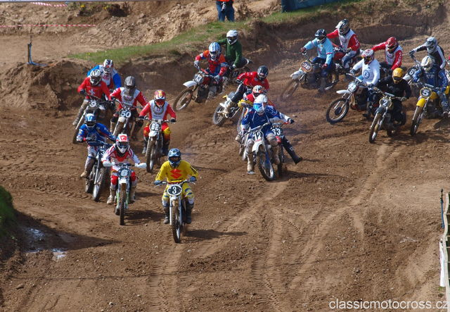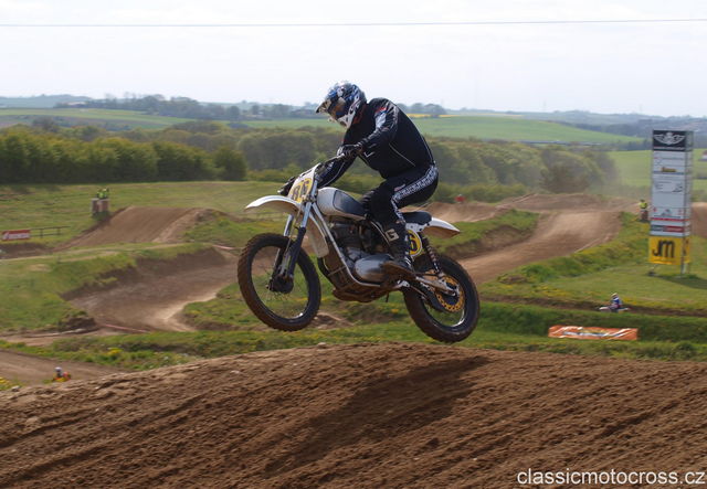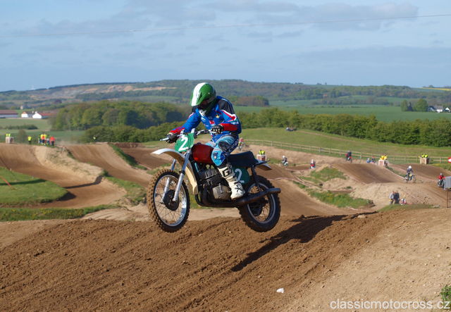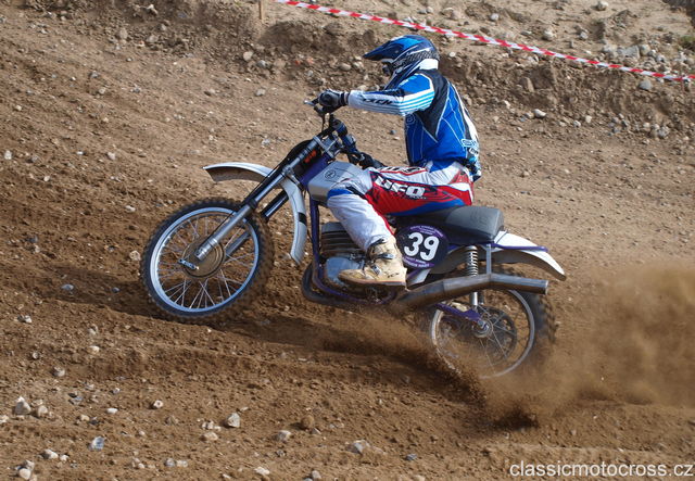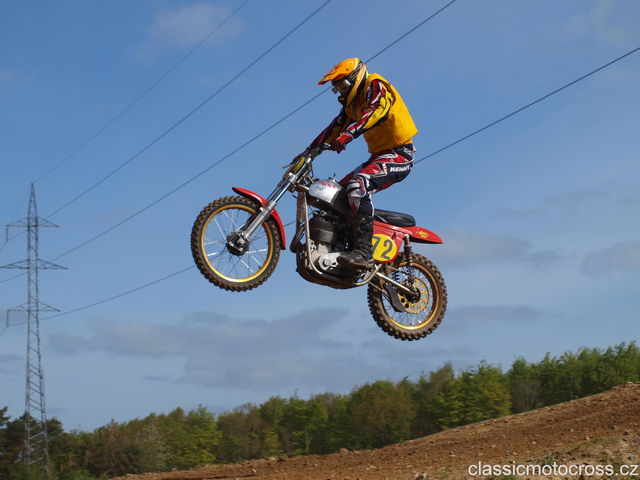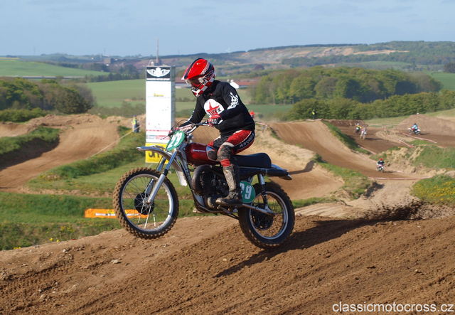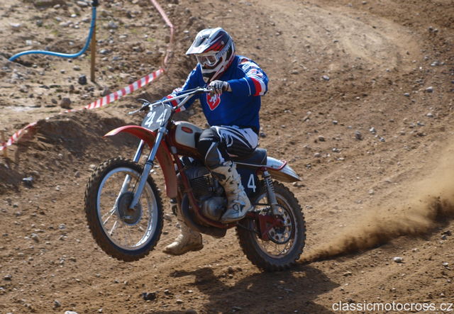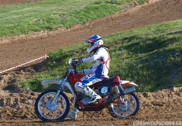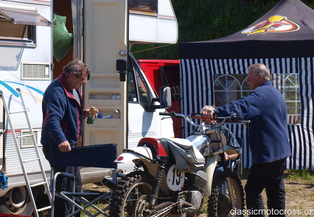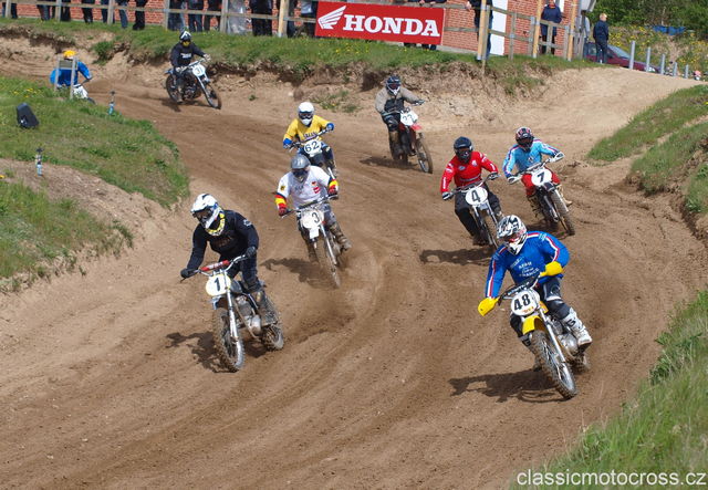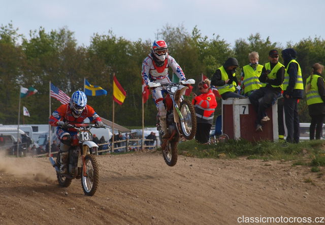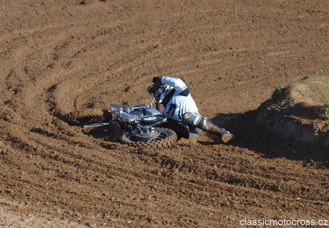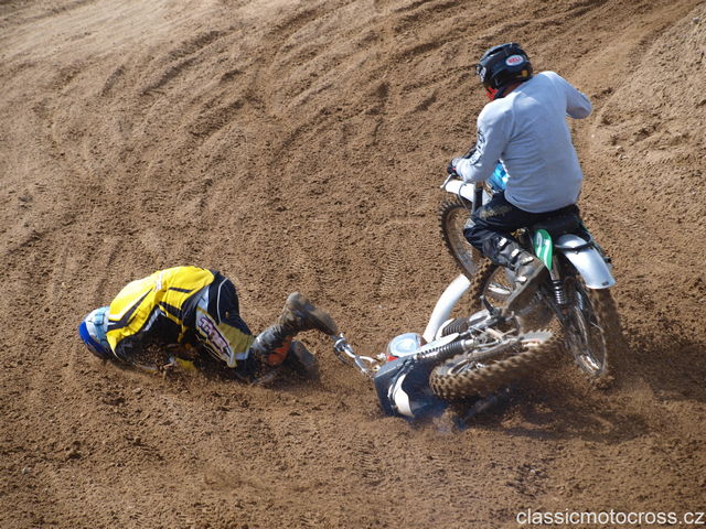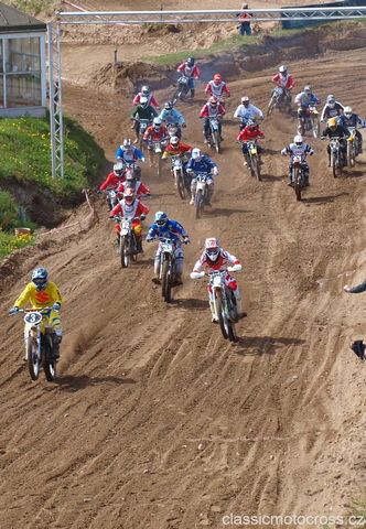 V 13:00 se staví na start první rozjížďky nejmladší závodníci. Signálník ukazuje 15, 5 a už upaluje stranou, start!!! Řev motorů vytočených do bezvědomí, kdy v první zatáčce se láme chleba. A nejen ten. Rakušan na suzuki upaluje jako čert, za ním je belgický jezdec a David je hned za nimi! O Karla se opírá další Belgičan a Martin Rybák se probíjí za nimi. Dobrý, uff… Pole prolítne kolem mě, skáčou a točí doprava, pak sjezd, pár zatáček a uskákaná pasáž trati. Koukám po klucích, kdeže jsou, a nevidím číslo 12! Modrobílý dvoumetrový jezdec a motocykl by nešel přehlédnout! Kde je?? V dálce a prachu vidím, jak to tlačí… Přetrhl lanko na plyn… Ale závod se pro nás i bez našeho nejrychlejšího jezdce vyvíjí fantasticky. David tahá jak běsnej, Martin kousek za ním, super. Hned za desítkou nerychlejších práská originální netlumený výfuk Jawičky Radka Zahradníka a Edu Fiňka, který jede s ním a asi ho musí od toho šťípat v uších. A koukám, našim největším soupeřům se nedaří, Belgičan Verdoodt jede na prázdné gumě a u rakouské Suzuki plandá přední kolo, že je jezdec asi rád, že se vůbec vejde do vidlice. David dojíždí 4 a Martin za ním na 5. místě.