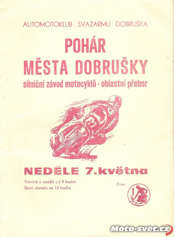 V roce 1972 se v Dobrušce jel poprvé na tříkilometrovém okruhu oblastní závod silničních motocyklů. Následující rok tam už bojovali o body do mistrovství republiky také nejlepší jezdci třídy 50ccm. O "Pohár města Dobrušky" se závodilo naposledy v roce 1975. Část trati v centru musela ustoupit výstavbě nového sídliště…