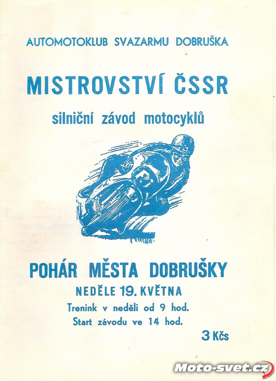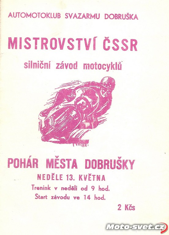 V roce 1974 v Dobrušce povýšili - jel se tam totiž Přebor ČSR ve třídách 125 (O. Kába st.), 250 (R. Seiboth) a 350ccm (Z. Havrda). V závodě M-ČSSR 50ccm zvítězil po boji F. Kročka před E. Klimkem a B. Fendrichem. Přes vzestupnou úroveň závodů se na tomto okruhu jelo naposled v roce 1975 ve třídách: P-ČSR 125 (B. Staša), 250 (V. Jeník) a 350ccm (A. Mrkvička). Mistrovství republiky třídy 50ccm vyhrál opět B. Fendrich před J. Šafránkem a E. Klimkem.