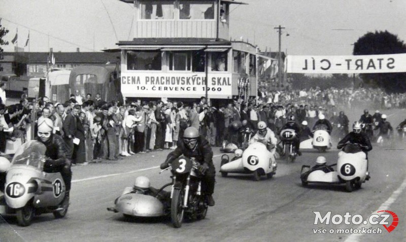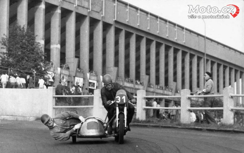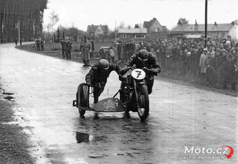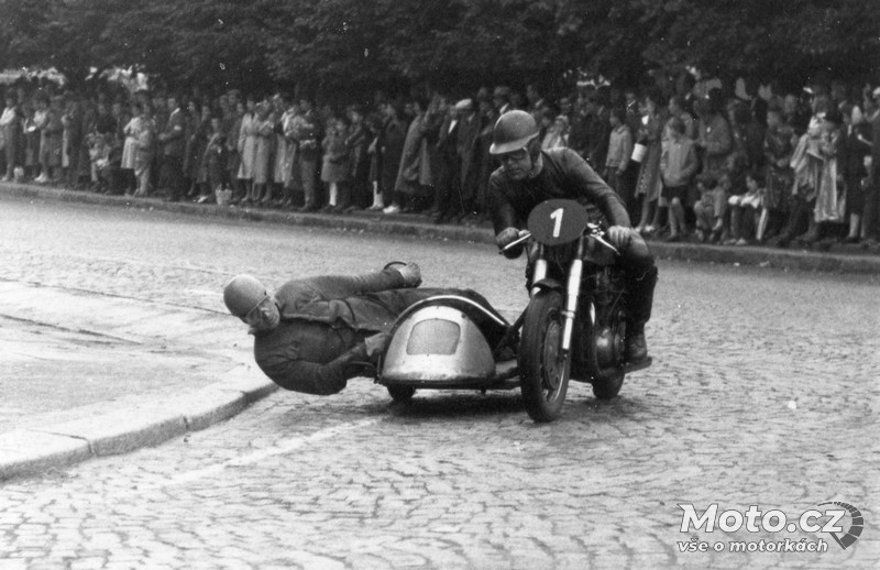 Silniční okruh „Pod Chlumem“ v Plzni - Újezdě. Oblastní závod. Vítěznému sajdkáru Ladislava Štajnera dělal spolujezdce domácí matador Jiří Lukšík...