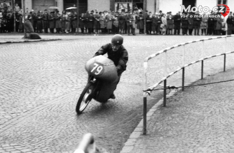 X. Hornická rubačka. M-ČSR. Nová dvoupatrová věž časoměřičů. 125: Bartoš měl před druhým Koštířem náskok 1 minuty ještě v předposledním kole. Do cíle však přijel s poruchou motocyklu ČZ o kolo zpět až na čtvrtém místě. Jen první dva měli plný počet kol. Jezdec na sedmém místě byl o 5 kol zpět.. 175: V. Parus na šestirychlostní ČZ udělal závod, když musel zastavit v depu z druhého místa a propadl se pořadím. Přesto dojel třetí o kolo zpět. 250: Šťastný zvítězil o minutu před Havlem. 350: z prvního místa odpadl pro poruchu Šťastný v 9. kole. Jen čtyři jezdci měli plný počet kol...