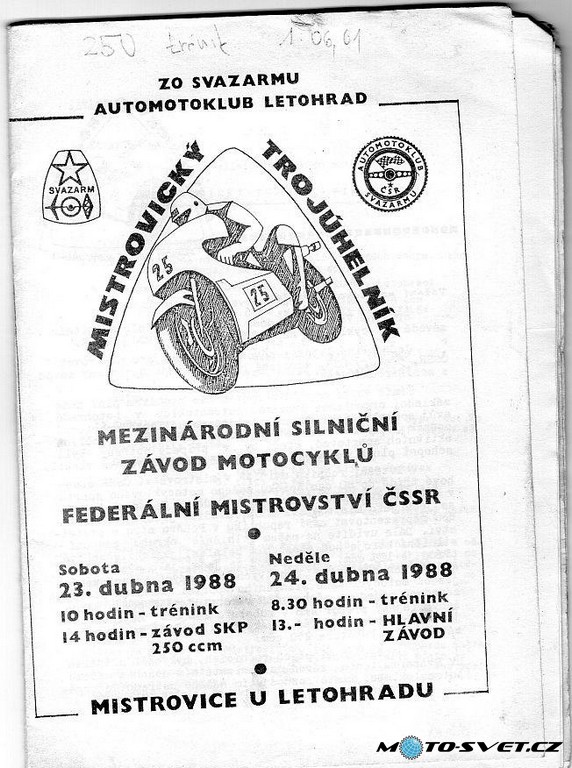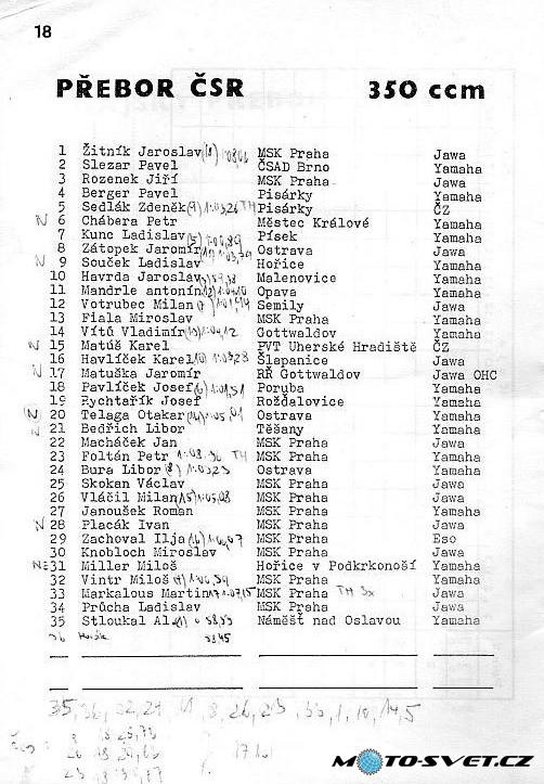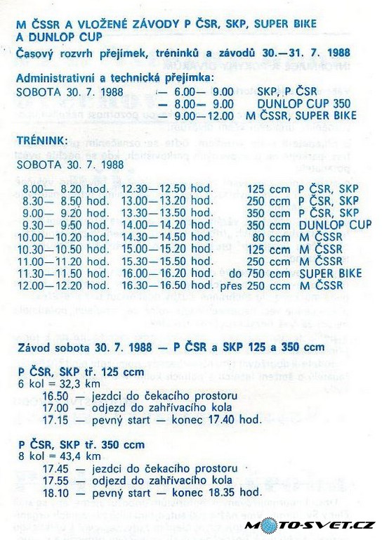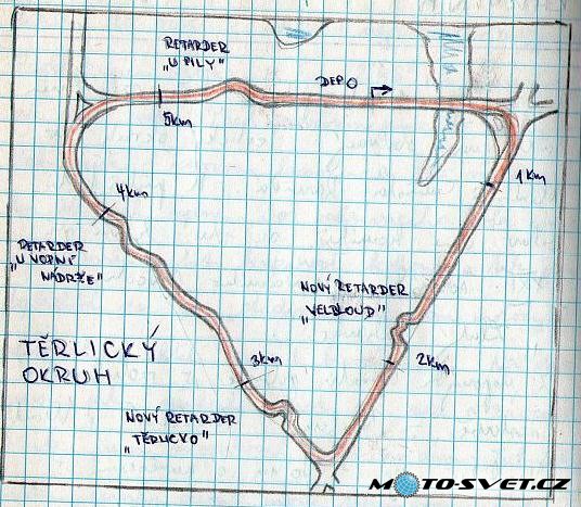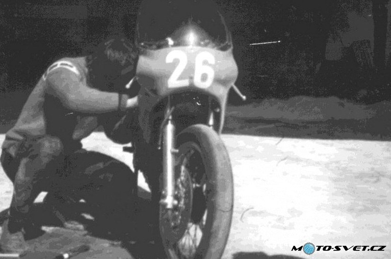 ých místech, především v průjezdu Těrlickem. Přesto patří k nejnebezpečnějším okruhům, na kterých se u nás ještě závodí. Náš závod se konal jako společný podnik s SKP C 350 již v sobotu odpoledne. Po problémech v tréninku (ostatně jako vždycky letos), kdy se zasekávaly šoupátka, byl motocykl připraven na závod perfektně. 9. tréninkový čas 3:04,73 ale nebyl právě nejlepší. Po odstartování se Milan chytil vedoucí skupinky jezdců. Postupně začali ujíždět Horák a překvapivě Talaga, který se na domácí trati ukazoval velmi dobře. V dalších skupinkách se bojovalo velmi tvrdě – Milan nedobrzdil retardér „u pily“, rozházel balíky slámy po celé šířce trati, ale pokračoval beze ztráty dál. K.O. znamenalo 5. kolo. Do boxů přijel Milan velmi pomalu a naznačuje, že nebrzdí přední brzda. Po několika vymáčknutí páčky ale motocykl brzdí – později se ukázalo, že příčinou závady byla vypadnutá brzdová destička – v depu už brzdil ocelový brzdič. Milan opatrně vyjíždí, ale v další zatáčce to balí – riskovat na takové trati nemá smysl. Potřetí letos vyhrává Horák, 2. je Pavlíček a 3. Sedlák. Smolař Talaga odpadl ve 4. kole. Martin je až 6. po problémech s motocyklem.