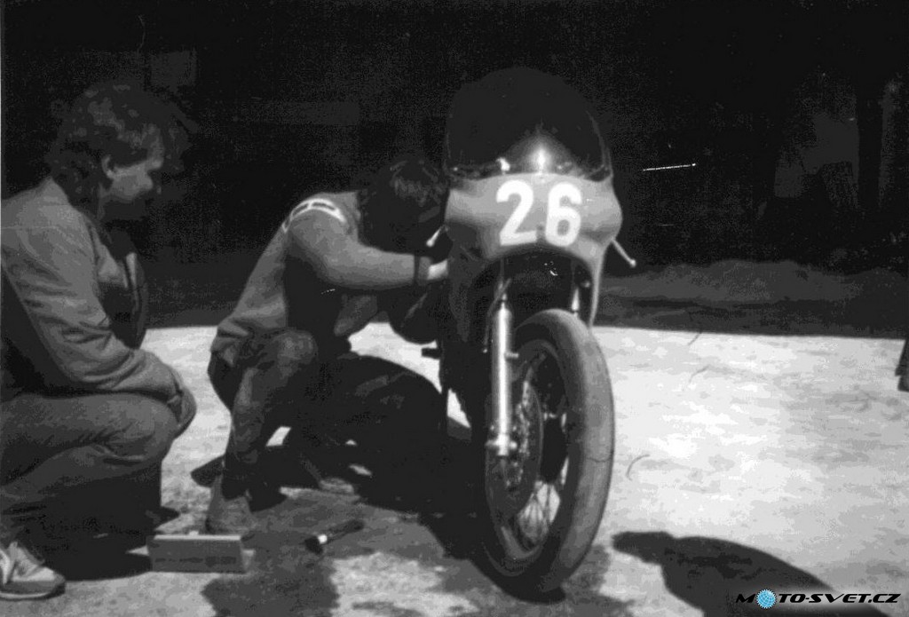 V roce 1988 jsme se spojili s týmem Martina Markalouse a jezdili na závody společně. Tady je Martin na předchozím podniku v Sendražicích, kde Milan nestartoval. Je to foceno po nedokončeném závodě 350 – havárie z důvodu prázdného zadního kola.