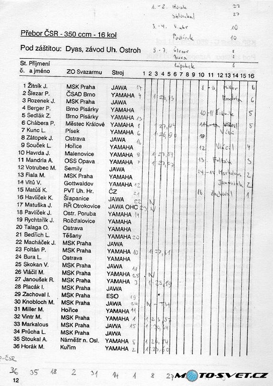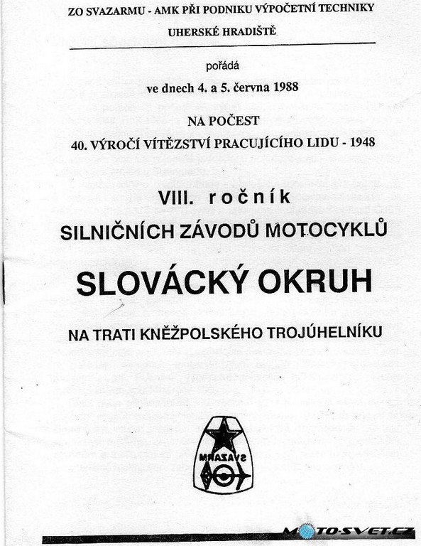 Na závody v UH jsme se všichni těšili, tady Milan před 4 lety zajel výborně a získal svůj první zelený věnec. Letos se nám ale závod nepovedl. Na programu dvoudenních závodů na Slováckém okruhu byly již tradičně SKP C 125, 175, 250, ABC 80, M ČSSR 80, 125 MTX, KLASIK 500 a náš P ČSR 350. K trojúhelníku jsme dorazili v sobotu odpoledne a v klidu shlédli závody SKP C, kde místní matadoři předvedli několik směšných i nebezpečných havárií. Zvláště jízda na zádech (Hečko) po chodníku v Kněžpoli se nedoporučuje! V neděli byli oba jezdci správně bojovně naladěni, když předtím do 2 hodin ladili formu na zábavě. Tentokrát ale zradily motocykly. Zatímco všichni jezdci P ČSR 350 vyrazili na 1. seznamovací trénink, my jsme smutně seděli nad nepojízdnou Yamahou. Nešťastně ulomený šteft hlavy válců zastavil Milana ještě dříve, než vůbec vyjel k tréninku. I když jsme se hrozně snažili vytočit zlomený konec z karterů, v polních podmínkách kněžpolského depa to nebylo možné zvládnout. Tak jsme alespoň drželi palce Martinovi. Do závodu P ČSR 350 se kvalifikovalo nejlepších 21 jezdců z 24 přihlášených. Nejrychlejší byl překvapivě Vintr za 1:23,57. V nemocnici ležel starý Knobloch, kterého Žito v tréninku poslal mezi okrasné smrčky před kněžpolskými domy. Samotný závod byl dokonalou kopií toho letohradského – jenom vedoucí jezdci si prohodili pořadí 1. Horák, 2. Stloukal. Za nimi se tvrdě bojovalo na úzké a nebezpečné trati. Po odpadnutí Kunce, Mandrly i Vintra dojeli ostatní jezdci v pořadí 3. Pavlíček, 4. Šlezar, 5. Muller, 6. Vítů, 7. Žitník, 8. Zátopek, 9. Janoušek, 10. Zachoval (ESO 350!), 11. Matuška a 12. Matúš. Martin Markalous po problémech v tréninku (15. čas 1:30,64) odpadl po několika nadějných kolech pro poruchu na spojce. Přes totální neúspěch se chystáme na vrchol sezóny – závody na autodromu v Brně. Milan s Martinem si tam dokonce zajeli zatrénovat a vyladit motocykly na nejdůležitější a nejprestižnější závod roku.