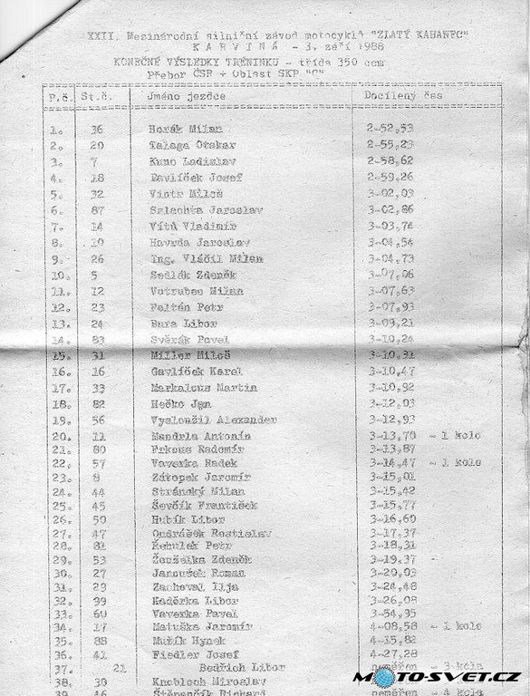 Téměř celou cestu do Karviné pršelo. Jen tak zřejmě nezapomenu na opravu upadlého výfuku po nájezdu do hluboké louže, při které jsem ležel pod autem v proudu po silnici stékající vody. Ta se ostatně dostala všude. I do karburátorů motocyklu a tam pak zlobila. Během tréninků zůstávala viset šoupátka, takže jízda byla spíš utrpením. Ve vlastním závodě – v suchém počasí po dokonalém vyčištění karburátorů – už šoupátka nezlobila, ale vyskytla se jiná závada. Do pátého kola jsem bojoval s Petrem Foltánem o čtvrté místo. Držel se mě díky chybám, kterých jsem se dopouštěl, neboť motocykl mi jel podstatně rychleji, než jemu. Ve 2. kole jsem netrefil pořádně do retardéru „u pily“ a rozhozením balíků jsem ho částečně rozšířil. Je fakt, že jsem se při tom pořádně lekl, ale kotrmelec se nekonal. O tři kola později jsem v tom samém místě při intenzivním brzdění „ztratil“ přední brzdovou destičku. Ještě že se to dalo projet rovně. Následné „napumpování“ brzdiče bylo přinejmenším nerozumné, neb mělo za následek částečné poškození předního kotouče.