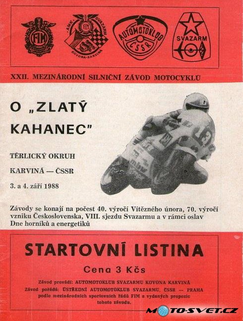 A na další závod jedeme až začátkem září na obávaný Těrlický okruh v blízkosti města Karviná. U příležitosti Dne horníků se zde koná již XXII. ročník populárního závodu o „Zlatý kahanec“. Z úsporných důvodů jedeme v redukované sestavě – Milan, Tomášové, Martin Markalous, já + Volha s přívěsem + 2 motocykly. Celou cestu leje jako z konve a náladu nepřidá ani upadlý výfuk u Volhy. Pršet přestává až v sobotu ráno a tak znovu musíme počasí poděkovat, že se vždy na tréninky a závody dá do pořádku. Několik slov ke klasické těrlické trati, na které se jezdí již od roku 1967 (původně v opačném směru). Za poměrně krátkou dobu své existence si vyžádala již několik smrtelných havárií motocyklových i automobilových jezdců (mimo jiné Johler, Franc…). Po loňské tragédii Angličana Luise Witha na ní přibyly 2 nové šikany, které zpomalily rychlosti v nebezpečn