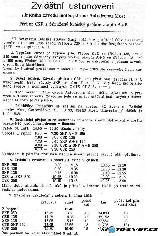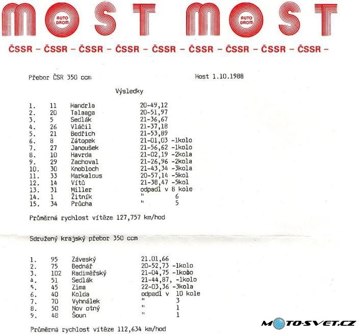 Poslední a rozhodující závod sezóny se koná na malém okruhu autodromu v Mostě. Milan zakládá ad acta povolávací rozkaz do Mikulova – vždyť jde o postup do mistrovství ČSSR! Současně se koná v Hričově M ČSSR 250, takže chybějí favorité Horák, Stloukal, Pavlíček, Kunc. Mladí aspiranti postupu si to tedy můžou rozdat mezi sebou. Po měřeném tréninku je Milan až 7. s časem 1:12,70. To, že Milan není v plné formě, dokazuje Martin Markalous s časem 1:09,77 s pomalejším motocyklem. Jeho šance na postup končí ale v posledních kolech 2. tréninku – upadlý výfuk=zadřený píst na babičce Jawce. Startuje tedy alespoň s Junákem. Po startu 350 je velmi dramatický souboj na špici Mandrla, Talaga, Sedlák, kteří ostatním odjíždějí. Milan kontroluje 4. místo a my se v depu domlouváme, že někdo z vedoucí skupiny odpadne a tím se Milan dostane na 3. a tj. 4. postupové místo celkově. Je to neuvěřitelné, ale všichni 3 vjíždějí do posledního kola těsně na sobě. V poslední zatáčce padá Sedlák, náskok je ale tak velký, že stačí nasednout a dojet o 0,51 s. před finišujícím Milanem. Velké štěstí z Brna se obrátilo a tentokrát přálo soupeřům. Sportovně ale musíme uznat, že Zdeněk Sedlák byl tentokrát lepší a 3. místo si zasloužil. Navíc to je sympatický chlapec a s jeho týmem se kamarádíme.