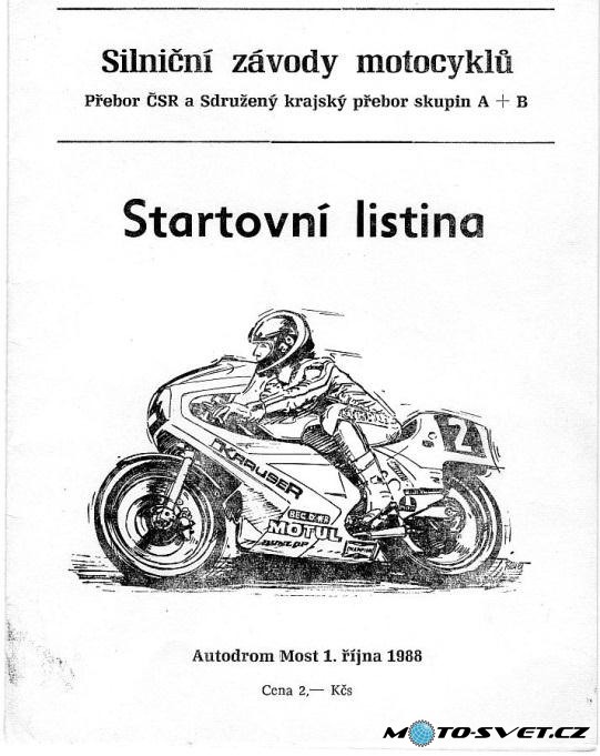Velký význam pro závod v Brně měl trénink, který jsme absolvovali s Martinem asi 2 týdny před vlastním závodem. Navzájem jsme se vyhecovali a zajeli dosti slušné časy (kolem 2’41‘‘). O to víc jsme se těšili do závodu, kde jsme se chtěli ukázat v tom nejlepším světle. Po tréninkách to ovšem zrovna nejrůžověji nevypadalo. Prokluzující spojka a čas 2‘46‘‘ mi předurčily až třetí řadu. Před závodem jsme do spojky přidali ještě 1 kovovou lamelu a bylo vše v pořádku. Ne však úplně. Do zahřívacího kola jsem zapomněl pustit benzínové kohouty a tak jsem doplachtil na „stadion“ kde jsem motocykl odstavil a chtěl zavřít benzín… Na start jsem pak spěchal snad víc než v závodě. Stále jsem si opakoval „Já mu dám – technicky čistě…“, čímž ocenil mou tréninkovou jízdu Martin Rak. Ale nejen to mne hnalo po úspěšném startu (2. flek) kupředu. Zapříčinil to i Martin Markalous, který si mě dovolil předjet (!) a odsunout na páté místo. Nezbývalo než přidat (později brzdit), čímž jsem se dostal na časy 2‘40‘‘ a v poslední zatáčce podjel v té době druhého Talagu (přidřené ložisko zadního kola). Umístění jsem se dozvěděl až po objetí čestného kola.