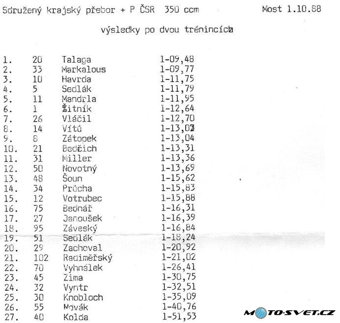 Závod v Mostě, přestože mi nakonec otevřel vstup do federálu, byl zajet velmi slabě. Co kalkulací a úvah mu předcházelo a nakonec výsledek pod psa! Ukázalo se, že spoléhat na to, že někdo nedojede, se nevyplácí. Jak v prvním, tak i v druhém tréninku jsem měl problémy s prokluzující spojkou. Před závodem mi na mé naléhání Danulka koupila dárek k Vánocům – téměř novou spojku od Vítů, kterou jsem hned použil. Jaké však bylo překvapení, když v zahřívacím kole opět prokluzovala. Šlo o sjetí lakované vrstvy na lamelách, což jsem ovšem nevěděl, a tak jsem první tři kola točil jen do 10 000 ot./min, než jsem si všimnul, že už je to v pořádku. Tak jsem ztratil kontakt s prvními třemi jezdci a zvolil vyčkávací taktiku. Velké rezervy jsem měl v projíždění dvojité zatáčky po startu, kdy jsem příliš brzy brzdil. Při výjezdu z předposlední zatáčky se mi zase několikrát stalo, že jsem tam měl o kvalt víc – neomluvitelná chyba. Dvakrát během závodu jsem předjížděl celkem slušně jedoucího Vítů v přesvědčení, že to je odpadlík z vedoucí trojice, avšak chyba lávky. Naopak do cíle pomalu dojíždějícího Sedláka jsem za soupeře nepovažoval. Po závodě jsem byl na sebe dost naštvanej a uvažoval, mám-li se vůbec do půllitrů cpát, když nejsem schopen zajet pořádně ani přebor. Nakonec jsme se však přeci jen s Jirkou domluvili, že zažádáme …..