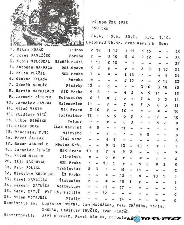 Prvním mistrovským podnikem sezóny v Čechách jsou tradičně televizní závody v Letohradě. Již před týdnem se sice závodilo v Brně, kde se výborně uvedl Martin Markalous vítězstvím v SKP C 350 (přes 2 havárie v tréninku), pro nás to naostro začalo až v Letohradě. Na programu byl již v sobotu závod SKP A+B 250, v neděli potom další tréninky a závody P ČSR 350, M ČSSR 250 1V, 125 MTX, 80 ccm a MEZ 1V se slabou mezinárodní účastí. Do Letohradu jsme vyrazili již v pátek večer ve stabilizované sestavě: ŽUK, ŠKODA, 3 motocykly, Martin Markalous, Tomáš Němec, paní Markalousová, Milan, Tomáš, Dana a já. Protože byla zima, odpadl tradiční nocleh na seně pod dohledem hasiče, ubytovaní jsme byli v noclehárně Letohrad. Tréninky probíhaly dobře přesně do polovičky. Potom se rozbilo zapalování u Junáka tak, že jsme ho už nedali do závodu dohromady. A aby byla smůla úplná, nepodařilo se nastartovat YAMAHU do 2. tréninku. Opět jsme byli málem na infarkt. Čas ve 250 1:06,61 byl 2. nejlepší jenom 0,02 s za prvním Sedlákem a určitě to nebylo Milanovo poslední slovo. Takhle se Milan po startu 250 proběhl k hospodě U Novotnů a sledoval nepříliš zajímavý závod naší 3. ligy. Kdyby Junák vydržel, věnec byl jistý. Čas po 1. tréninku 350 1:05,98 stačil na kvalifikaci do závodu, ale pouze na 15. místě. Martin byl na tom ještě hůře, když 2x havaroval (opět), objel jen jedno celé kolo za 1:07,15 a byl 17. z 18 kvalifikovaných. 6 jezdců se mohlo zabalit a jet domů (m.j. Chábera, Talaga, Miller, I. Placák). Závod P ČSR 350 zahajoval nedělní program. Start se nejlépe povedl nejrychlejší dvojici Stloukal – Horák, kteří okamžitě odjeli a ostatním nedali šanci. Tradičně špatný start měl Vintr, který nemůže utlačit těžkou Yamahu a ještě se plete do cesty dalším jezdcům. V tomto případě Milanovi, který tak odjel až mezi posledními. Naopak raketový Martin vypálil z poslední řady na 5. místo! V průběhu závodu si jezdci na 3. – 10. místě několikrát vyměnili pozice. Vintr, který nejhůře odstartoval, se dostal až na 3. místo. Pro závady odpadli Pavlíček, Kunc a Votrubec, Martin byl 1x dlouhý na brzdy a spadnul na 9. místo. Milana opět potkala smůla, když mu upadla páčka a 2/3 závodu odjel bez spojky. 7. místo mezi Zátopkem (jednoválec!) a Foltánem je ale slabé.
