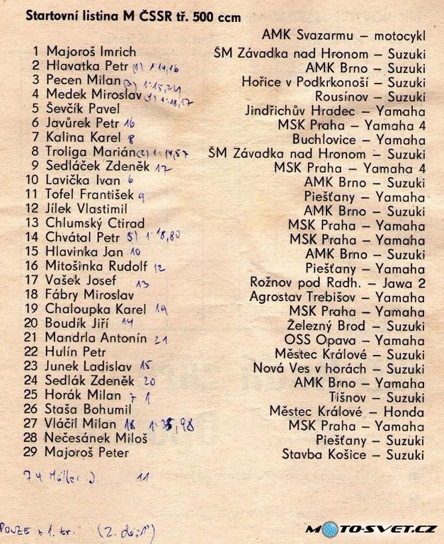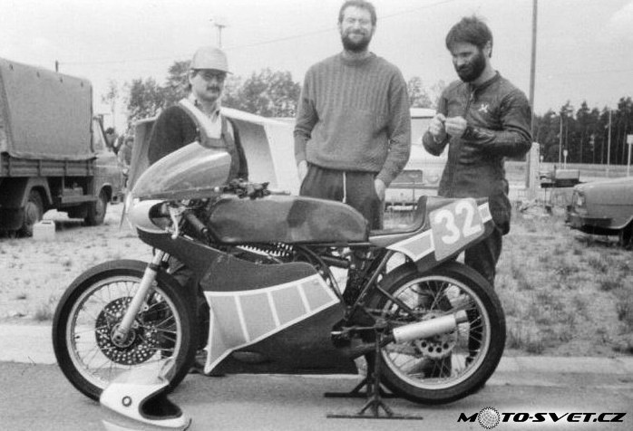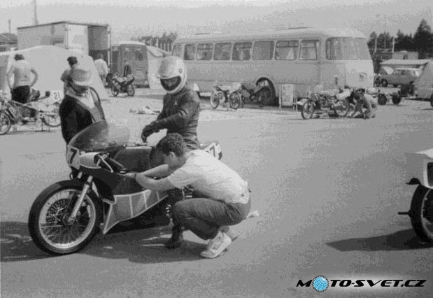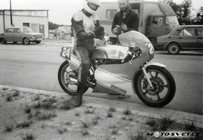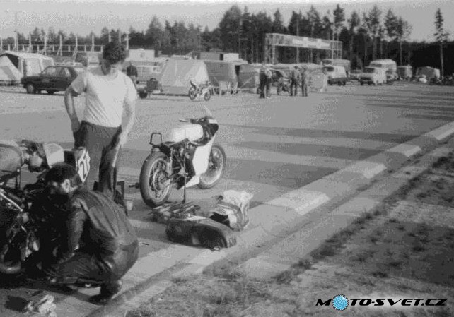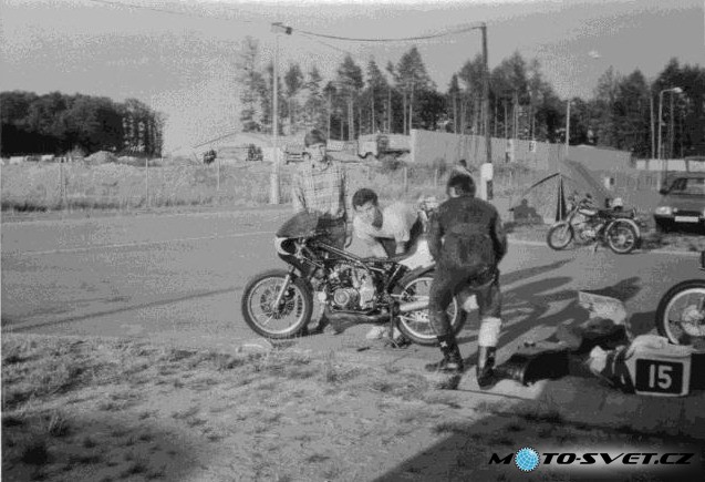 V tradičním termínu se letos konal první mistrovský závod našich kubatur – M ČSSR 500 + P ČSR 250 a navíc M ČSSR 125, 250, POHÁR a P ČSR 125. Program na 2 dny skutečně nabitý a to ještě většina jezdců (včetně nás) se 9.5. přesouvala na autodrom do Brna k dalším závodům. Bohužel se nám nepodařilo včas sehnat válce 250ccm (m.j. finanční potíže) a Milan se tedy soustředil pouze na třídu půllitrů. Tréninky v poklidu neprobíhaly. Problémy s natočením motocyklu (přes zimu někteří z nás trochu přibrali a byly potíže při roztlačení) vyřadily Milana prakticky z 1. tréninkové jízdy a na druhou začalo pršet. To znamená automaticky zasekávání šoupátek v karburátorech a jízdu pod psa. Výsledkem byl až 18. čas 1:35,98 z 21 účastníků. V tréninku se vyznamenal Petr Chvátal 5. časem 1:18,80 a se startem z 1. řady byl nadmíru spokojen. Před odpoledním závodem se konal ještě krátký seznamovací trénink v dopoledních hodinách. To byla příležitost konečně si osahat trať na suchu a v klidných podmínkách. Po roztlačení, kdy jsme byli opět blízko infarktu, Milan vyjel. Konec tréninku byl neradostný – zaseknutá šoupata v poloze plný plyn v jedné z nejrychlejších pasážích tratě (před benzínovou pumpou) znamenala pád a jízdu cca 150 metrů hezky po zádech vedle motorky. Milanovi se naštěstí nic nestalo (až na odřeniny), horší pohled byl na motocykl. Celá pravá strana kompletně zbroušená včetně řídítek, páček a vodní pumpy. Na příště je potřeba podložit pumpu pod kapotáží, protože další jízda po pravém boku bude znamenat úplné prodření pumpy. Team mechaniků v čele s Milanem odvedl perfektní práci a na závod bylo všechno O.K. Samotný průběh odpoledního závodu nebyl ale pro nás příliš zajímavý – Milan platil nováčkovskou daň a po dopolední havárii nebyl ještě ve své kůži. Nakonec z toho bylo 15. místo.
