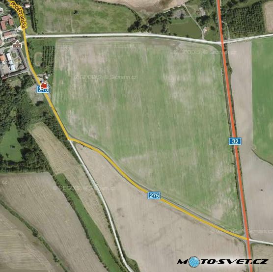 Jednoduchý tvar závodní trati na trojúhelníku u Dymokur; start i depo bylo u rybníka v horní části obrázku.