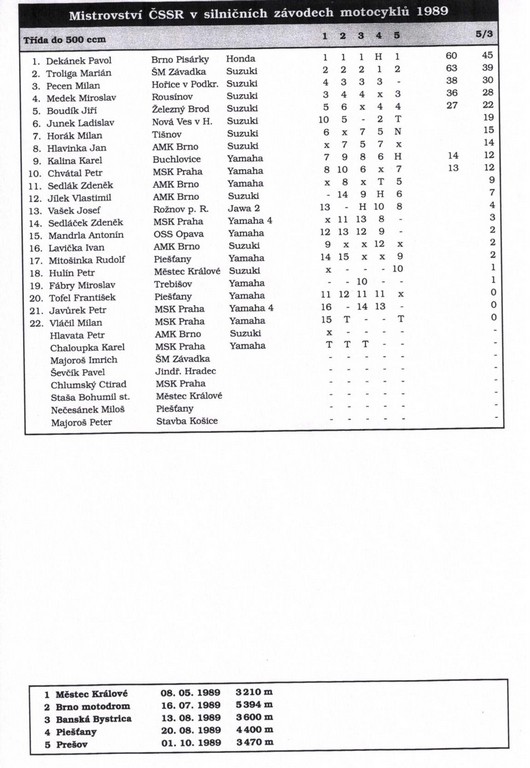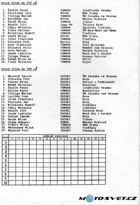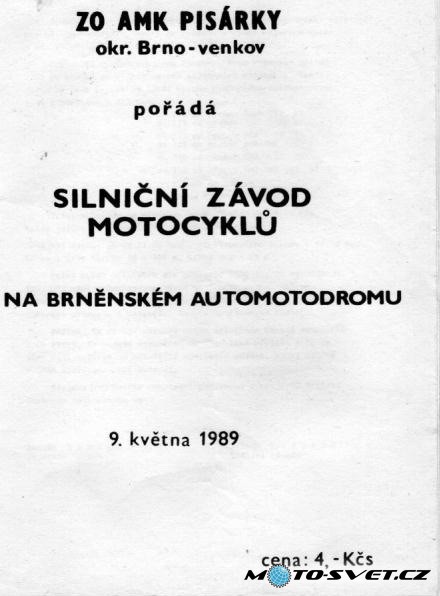 Barevný konvoj různých Avií, Žuků, Mikrobusů a přívěsů se po skončení závodů v Městci přesouval do Brna, kde se na autodromu konal závod P ČSR 125, 350, SKP AB 125, SKP C 125+175, 350, KLASIK a VOLNÁ TŘÍDA 500. Ta byla naším cílem, zatímco Martin ladil motocykl na 1. mistrák P ČSR 350. Tréninky probíhaly v klidné, slunečné pohodě. Chybí nám bohužel časové srovnání (pořadatelé vyvěsili pouze pořadí na start. roštu bez docílených časů), ale fakt, že v jedné řadě s Milanem stál Petr Chvátal i Vašík, hovoří mnohé. Abych nezapomněl, Martin se v tréninku „vyznamenal“ nájezdem do Bedřicha, který šel na záda a do pole. Kdyby nejel Bedřich tak pomalu, tak by se mu to nestalo! K samotnému závodu, který bohužel netrval pro Milana dlouho. Když po výborném startu sklápěl motocykl do první zatáčky, přiřítil se zprava Petr Chvátal (nedobržděno), obtiskl svoji přední gumu na zadní krovku Milanovy Yamahy a nemilosrdně ho poslal mimo trať. Měla to být výstraha nováčkovi, že ve federálu to nebude mít snadné?? I když se Petr po závodě moc omlouval, Milan byl pochopitelně nešťastný, neboť po pádu do štěrku se napadanými kameny zcela zablokovalo přední kolo. Kameny byly i v karburátoru! Tak skončily tři dny plné závodů, které nám bohužel příliš radosti nepřinesly. Za zmínku ještě stojí 1. místo Martina v P ČSR 350.