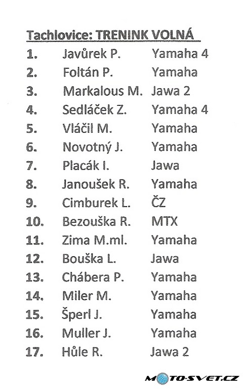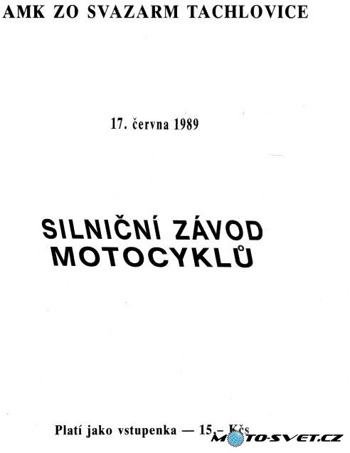 Na klasické přírodní trati v Tachlovicích se jezdí pravidelně závody veteránů, které jsou pro zpestření doplněny závodem volné třídy. Typický pouťák, ale protože Tachlovice jsou kousek za Prahou, náš team + Martin jsme byli při tom. Několik slov o trati. Něco podobného se již u nás nevidí. Už při jízdě autem hrozí zničení tlumičů na výmolech a dírách v asfaltu. Po startu trať klesá k pravé zatáčce, kde se napojuje na silnici asi 4m širokou, která jezdce přivede po otevřených, rychlých zatáčkách k první specialitě - napojení na hlavní trasu Praha – Tachlovice je spojeno s překonáním schodu cca 15cm mezi úrovněmi obou silnic. Pak následuje velmi pěkný rychlý úsek s poměrně dobrým povrchem a zatáčkami pravá-levá-pravá-levá. Nevýhodou jsou vrostlé jabloně na vnější straně – tady se spadnout nedoporučuje! Další zatáčka je za roh budovy JZD (zde Milan a dalších 5 jezdců spadlo v roce 1987), diváci stojí na krajnici jak ve vnitřním, tak i vnějším okraji trati. Kdyby natáhli ruku, můžou si na jezdce sáhnout v plné jízdě. Po průjezdu čeká sjezd tmavým stromořadím kolem hřbitova k pravoúhlé zatáčce do cíle. Jezdci si musí dávat pozor na brzdy – dům, který stojí proti trati, je obložen pouze starými pneumatikami a matracemi. Pak už trať stoupá k cíli, kde čeká zlatý hřeb trati – skok přes horizont v zatáčce mezi domy. Tady jezdci na rychlých motocyklech lét