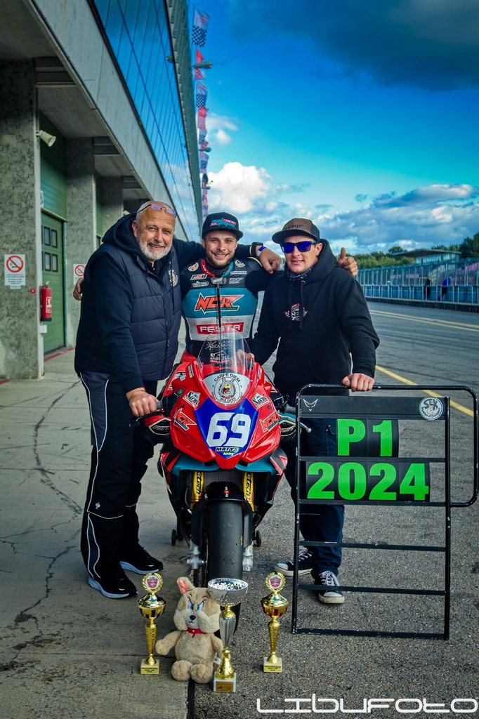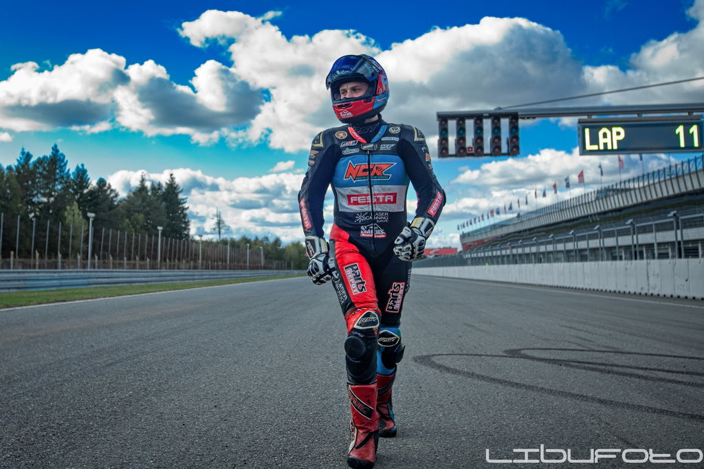 V neděli ráno jsme se svezli ve Warm Upu a čekali na druhý závod, který byl na jedenáct kol. To už byla slušná porce kol oproti sobotním šesti. Start se mi podařil, ale byl jsem opět druhý za Markem Červeným. První zatáčku jsem si najel lépe než Marek, takže jsem měl lepší výjezd a hned jsem ho do kopce předjel. Tím pádem jsem se v prvním kole ujal vedení. Marek se mě stále držel a já věděl, že nemám žádný náskok. Rozdíl byl jen pár metrů. Do toho jsme dohnali pomalejší jezdce o kolo a já čekal, že mě v tu chvíli Marek předjede, že najde nějakou skulinu. Nakonec se tak nestalo. Předjížděli jsme spoustu lidí, ale pořád jsem si držel první pozici. Při nájezdu do posledního kola jsem viděl, že mám náskok okolo 1,5 – 2 vteřin. V tomto kole byla nakonec vyvěšena červená vlajka a závod byl ukončen. Byla odjeta většina závodu, takže to znamenalo, že je konec. Zvítězil jsem i ve druhé závodě, navíc jsem zajel čas 2:13,5, opět nejrychlejší kolo závodu. Byl jsem velice šťastný, protože jsem v Brně jel dvakrát a vždycky jsem byl druhý. Nyní se mi podařilo dvakrát zvítězit, navíc se skvělým časem. Tím pádem jsem také vybojoval mistra České republiky pod AČR, CAMSem i pod Slovenskou motocyklovou federací. Měli jsme z toho obrovskou radost.